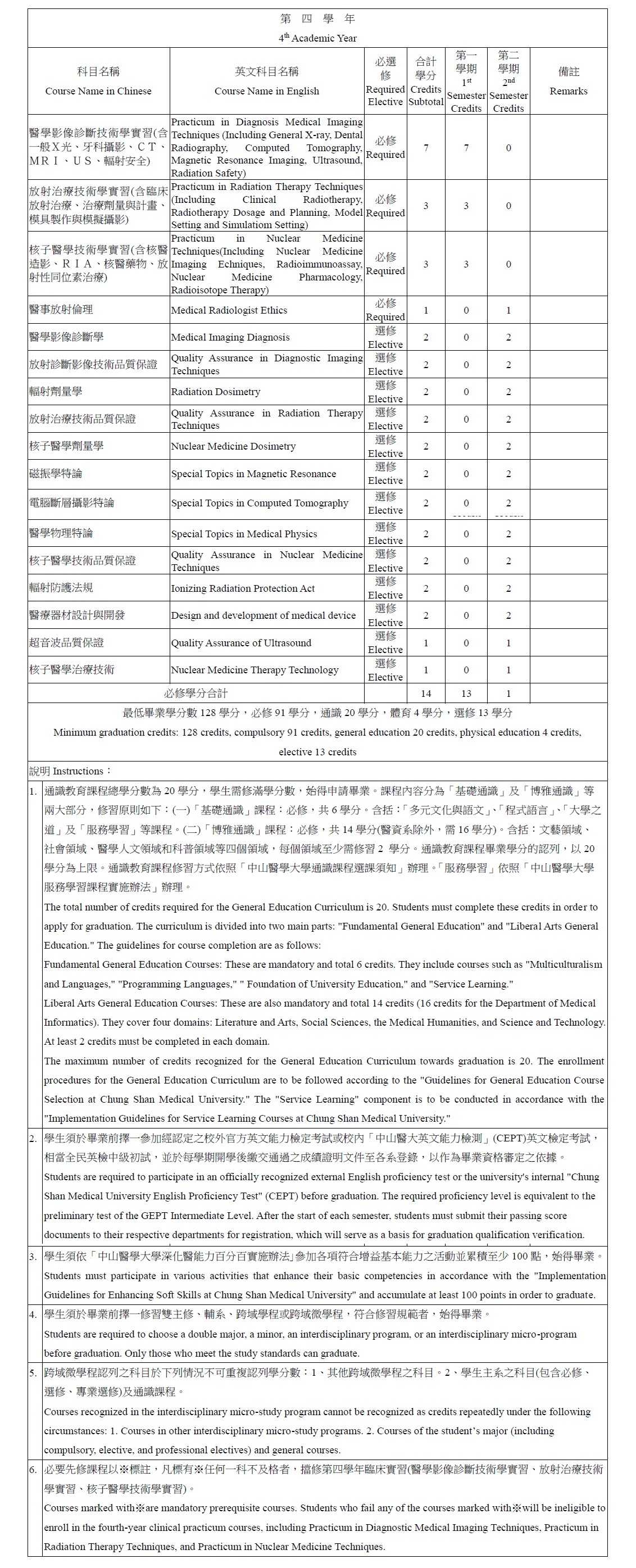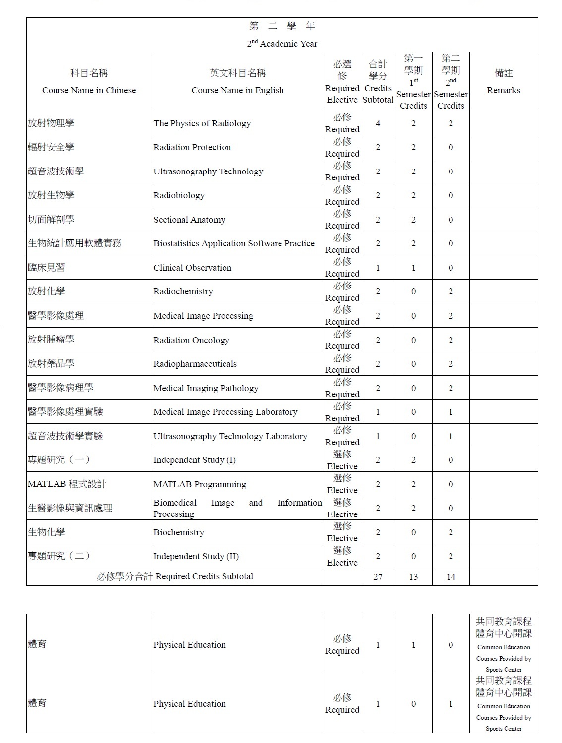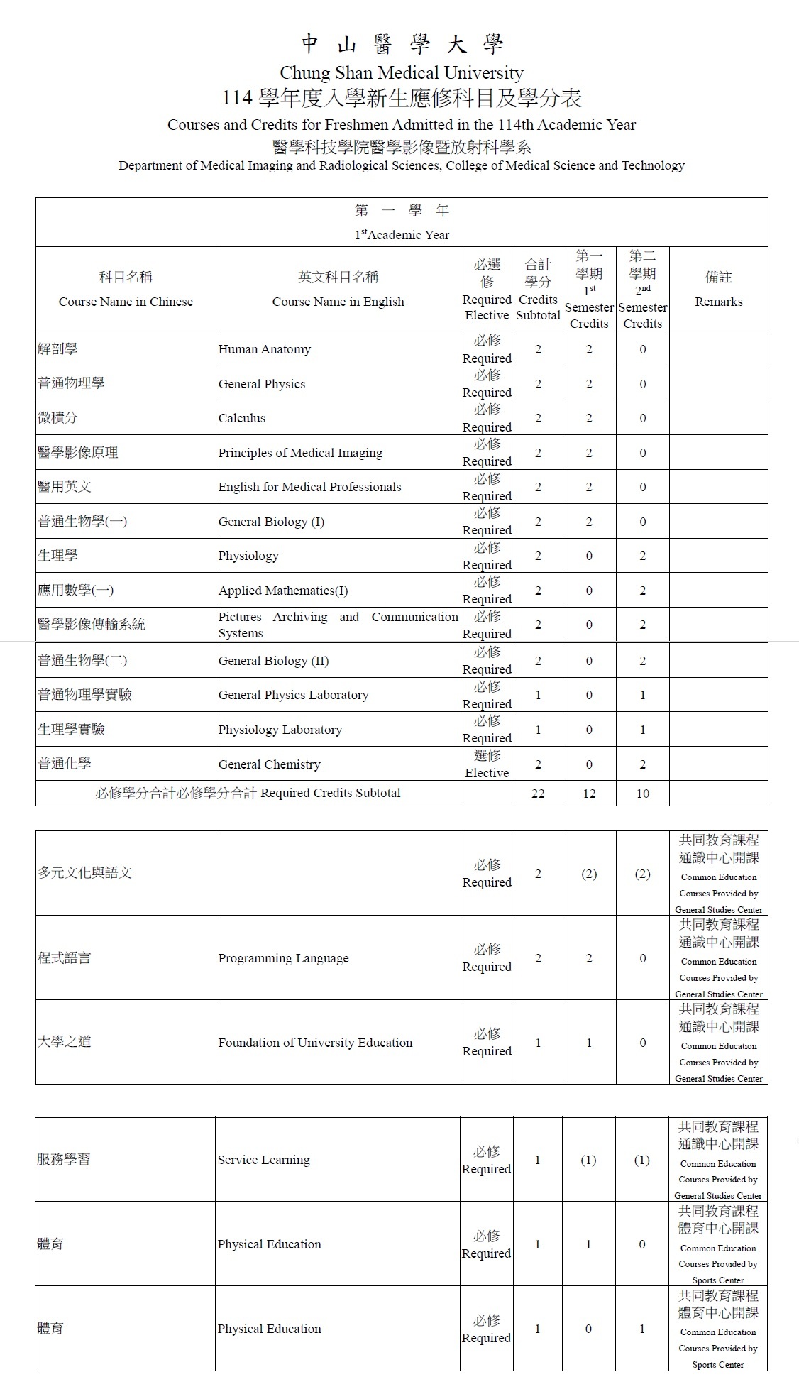 大學部科目學分表